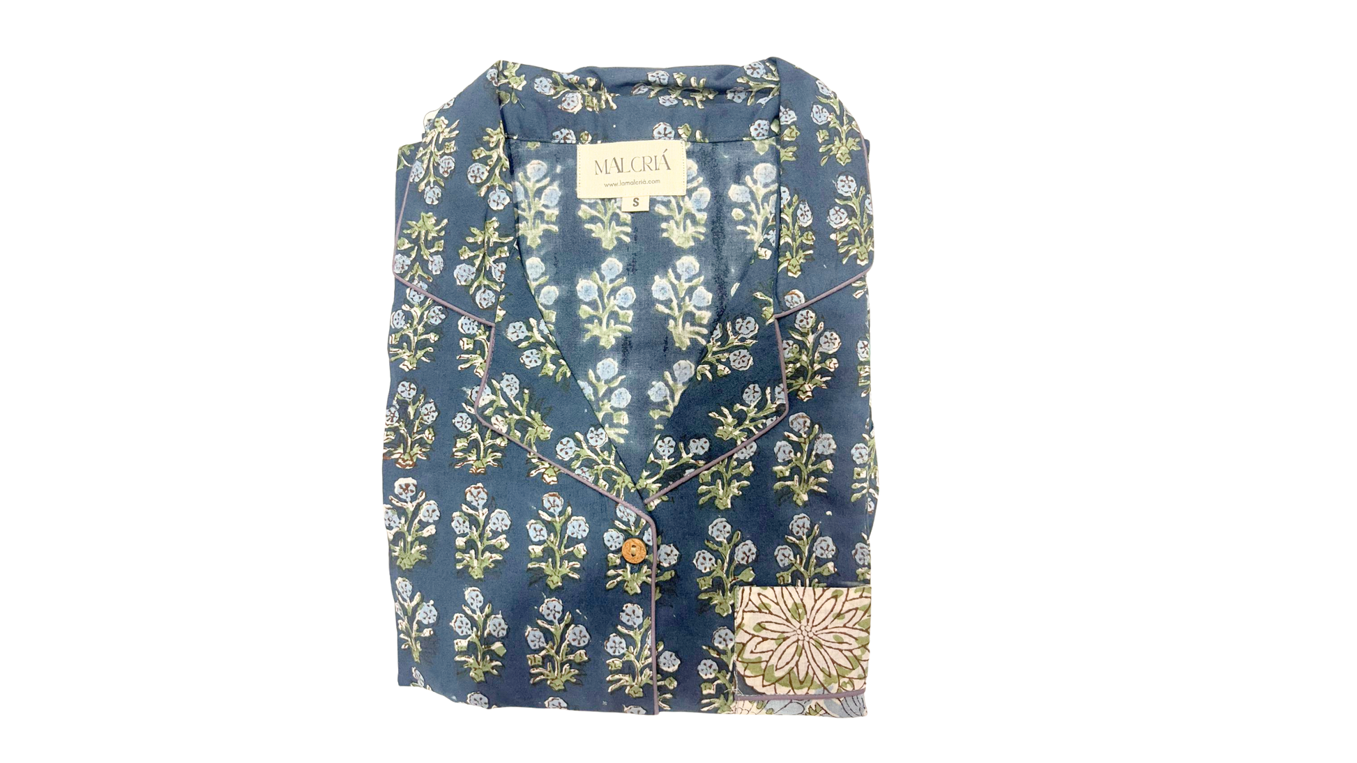 Pijama de algodón 100% fabricado artesanalmente con telas producidas en India. Su confección se realiza utilizando tintes naturales que lo hacen aún más especial.