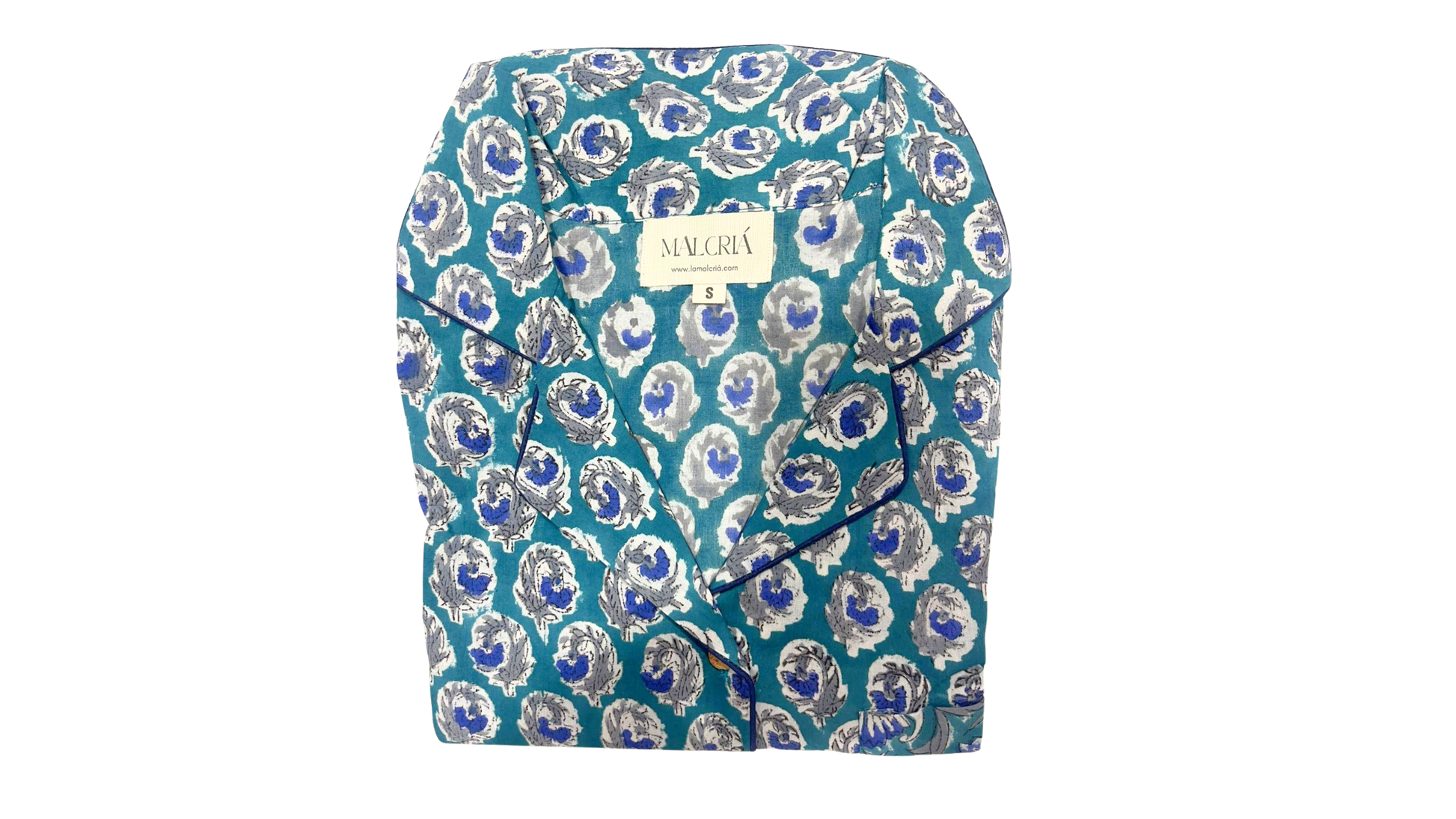 Pijama de algodón 100% fabricado artesanalmente con telas producidas en India. Su confección se realiza utilizando tintes naturales que lo hacen aún más especial.